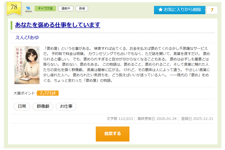 現在、アルファポリスのキャラ文芸大賞にエントリーしており、78位まで行きました!